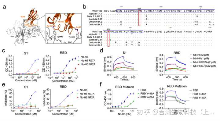 实验结果揭示了Nb-H6中和的机制是干扰RBD区域的Tyr449和Tyr489与ACE2的结合。Y449和Y489位于受体结合基序(RBM)内,并通过氨基酸序列比对发现在SARS-CoV-2和变种的RBD中高度保守,进一步解释了Nb-H6对SARS-CoV-2野生型和突变株的中和作用。