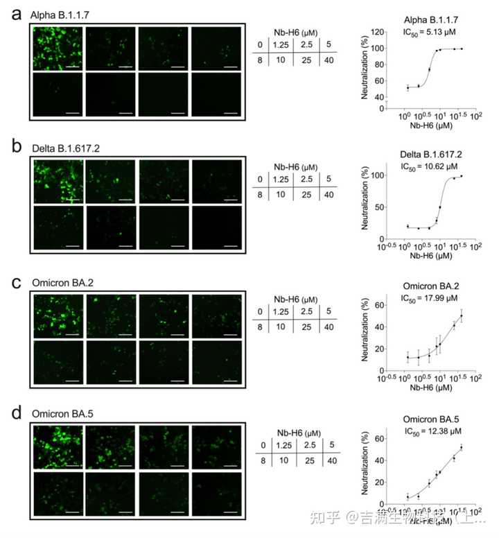 Fig.7 Nb-H6在体外对突变株 Alpha(B.1.1.7)、Delta(B.1.617.2)和Omicron(BA.2和BA.5)假病毒感染的中和作用