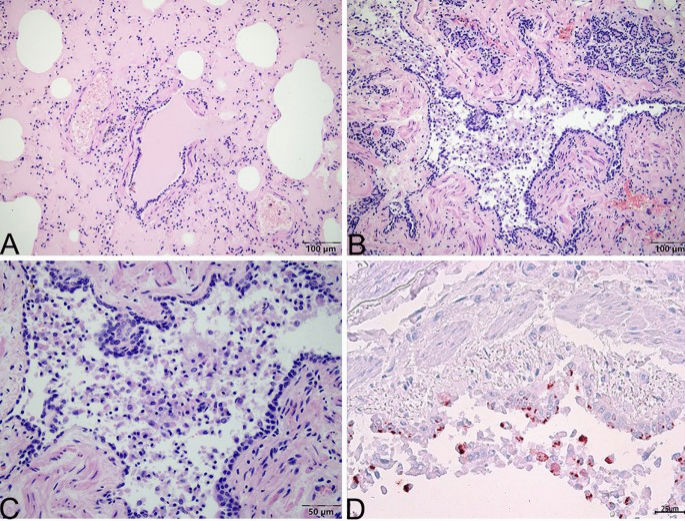 During the necropsy, the bladder was found to be full and dilated (20 cm?×?10 cm in diameter), holding 1050 mL of dark red urine. Congestion was presented on the surface of the bladder mucosa (S1 A and B). The renal pelvis of the right kidney showed effusion and dilation. The lungs appeared dull red, and there was swelling and liquid leakage present in the section analysed (Fig. 3). Moreover, there were no obvious abnormalities in other organs. A microscopic examination revealed coagulative necrosis of the massive glomeruli and tubules in the renal cortex, and bilirubin deposition in the tubule epithelial cells (S1C). The bladder had severe autolysis and the mucosa structure was disordered and homogeneous. The pulmonary alveoli were distended and filled with pink exudate. Many lymphocytes and exfoliative cells filled the bronchioles and no viral inclusion bodies were found in the epithelial cells of the bronchial mucosa. (Fig. 4A–C).