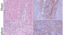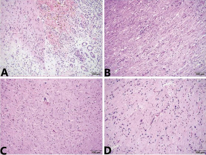 During the necropsy, meningeal congestion and a region of liquefactive necrosis in the right cerebral hemisphere with an area of approximately 2 cm?×?0.5 cm?×?1 cm were observed (Fig. 1). Moreover, no obvious abnormalities was observed in the other organs. The results of the histopathological examination indicated the presence of meningeal hyperaemia and haemorrhage, liquefactive necrosis in the cerebral cortex, a massive collection of foam cells, and heamosiderosis. Capillary hyperaemia, bleeding foci, oedema, vascular cuff reaction (lymphohistiocytic perivascular infiltrates), neuronal necrosis, neuronophagia, and demyelination reaction were visible in the brain parenchyma (Fig. 2).