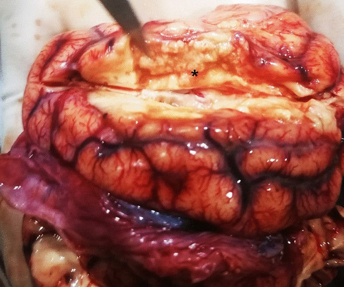 Gross observation of brain of Case 1. Meningeal congestion and a region of liquefactive necrosis in the right cerebral hemisphere with an area of approximately 2 cm?×?0.5 cm?×?1 cm are observed (*).