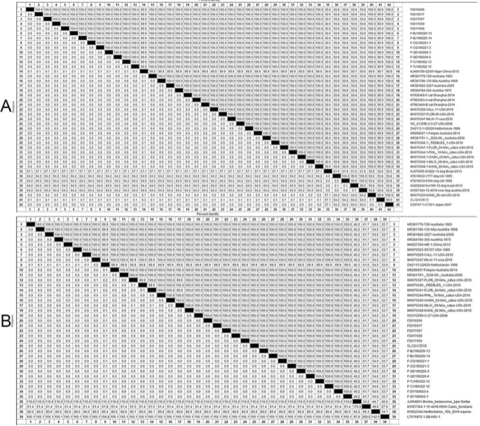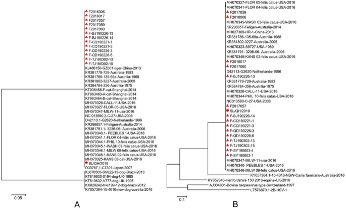 Similarly, SL/QH/2019 shared 100% identity with isolates of FHV-1 from domestic cats; however, there was a low degree of low identity (from 27.6 to 61.7%) with CHV-1 based on the gE gene (Fig. 6B).