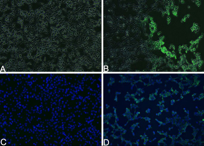 At 36 h post-inoculation, using the nasal swab supernatant of Case 2, FK81 cells showed an obvious cytopathic effect (CPE), characterized by a round shape, pyknosis, fusion, and aggregating like “fleece-pulling” (Fig. 5B) compared with the mock control (Fig. 5A). PCR revealed that cultures inoculated with the material from nasal swabs were positive for FHV-1. Using indirect immunofluorescence, most of the positive signal (green) of the presence of FHV-1 was shown to be located in the cytoplasm of FK81 cells (Fig. 5B,D) compared with the mock control (Fig. 5C). This finding showed that the FHV-1 isolate replicated in cells. These results further confirmed that the snow leopards were infected with FHV-1.