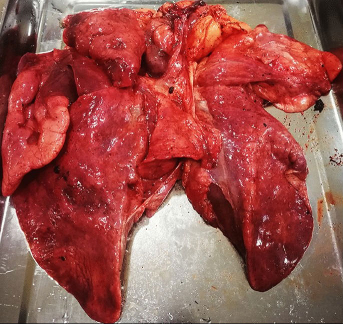 Gross observation of lung of Case 2. The lung presents dull-red, swelling, and liquid leakage from the section.