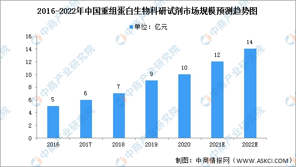 在中国,重组蛋白生物科研试剂总体市场从2016年的5亿元增长到2019年的9亿元,期间年复合增长率为21.64%,预计2022年市场规模将达到14亿元。