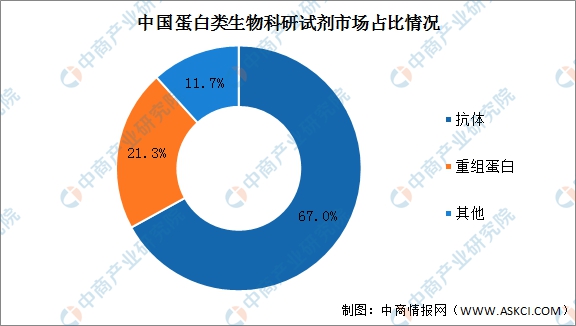 在蛋白类生物科研试剂市场中,抗体和重组蛋白产品合计占据蛋白类试剂市场的88.3%。